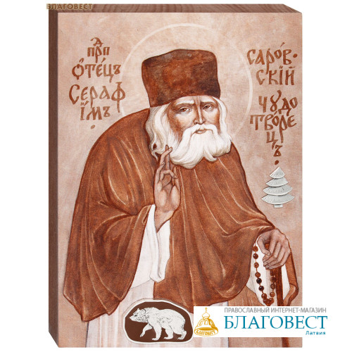 Святой Серафим отличался необыкновенной любовью к людям, приветствуя каждого человека словами: «Радость моя. Христос Воскресе». Нес подвиг старчества, утешая страждущих, помогая им своими молитвами и духовными советами. Преподобный был настолько добр, что все живые существа вокруг чувствовали его святость и тянулись к нему. Старца посещали дикие звери. Согласно преданию, святой кормил медведя прямо из рук.Материалы: липа, серебро, эмаль. Техника изготовления: УФ-печать, гальваническое серебрение, эмалирование, ручная работа.Икона соответствует православным канонам и освящена.
