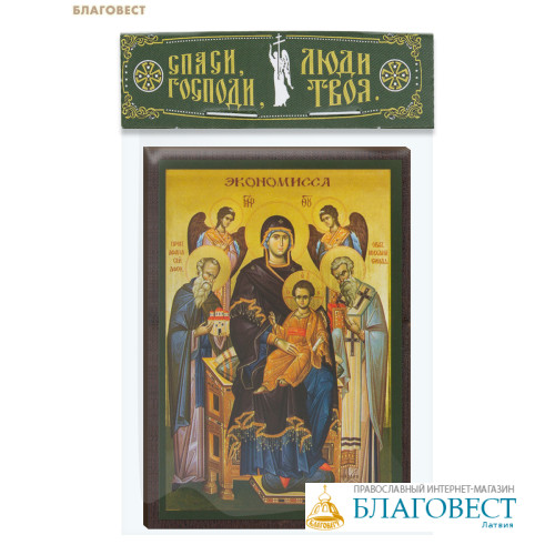 Изображение иконы Пресвятая Богородица «Экономисса» выполнено с использованием полиграфической печати с золотым тиснением. Тонкий слой ламинации надежно защищает изображение от внешних воздействий. Основа — МДФ толщиной 6 мм.