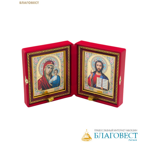 Складень малого формата представляет собой изящный футляр, отделанный искусственной кожей со вставкой из жаккарда. В закрытом виде фиксируется с помощью металлического замка. Внутри размещены иконы Спасителя и Пресвятой Богородицы, оформленные в багетные рамки под стеклом. Именно перед этими образами священник читает молитвы во время таинства венчания.В сложенном виде складень надёжно защищён, компактен и удобен для хранения. В раскрытом становится домашним иконостасом, напоминающим о дне бракосочетания.Прекрасный памятный подарок на свадьбу или годовщину семейной жизни.