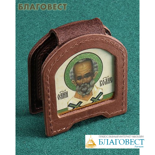 Икона дорожная "Святитель Николай Чудотворец" (натуральная кожа). Цвет темно-коричневый