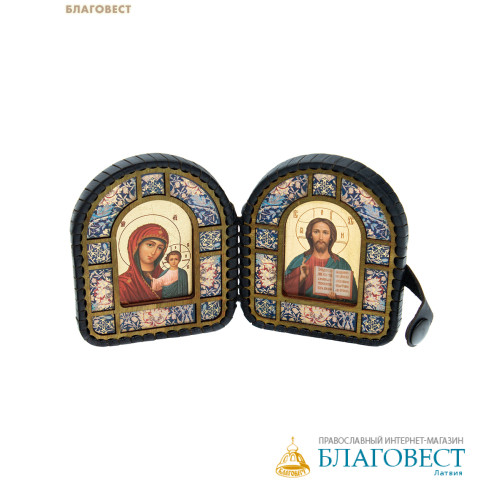 Складень кожаный Пресвятая Богородица «Казанская» - Спаситель, размер 7х8,5см (в раскрытом виде 14,3см), дерево