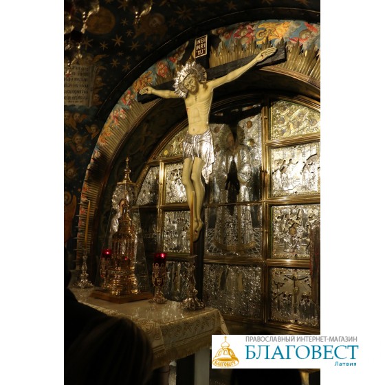 Голгофа. Мы плутаем по улочкам Иерусалима, проходим базарчик старого города и выходим на площадь перед великой христианской святыней – Голгофой и Храмом Воскресения Господня, более известного как Храм Гроба Господня. За массивной открытой дверью поднимаемся направо и вверх по узкой каменной лестнице на Голгофу. В полумраке, со множеством огоньков от лампад, в центре стоит Распятие, а под ним виден сквозь стекло камень с трещиной. Это скала, а вернее Голгофская гора.