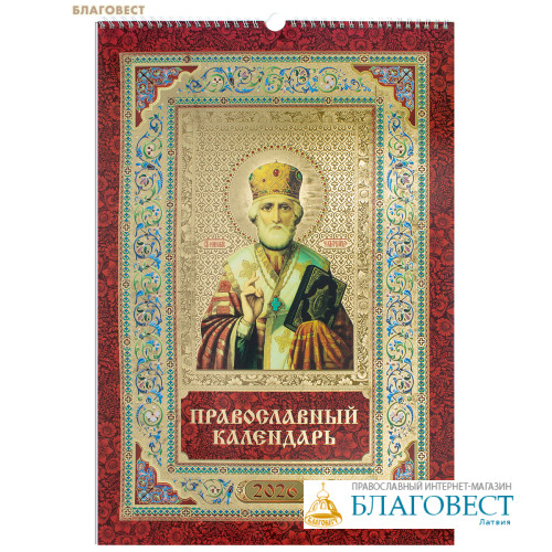 Православный настенный перекидной календарь на ригеле. С красочными иллюстрациями, с указанием праздничных и постных дней. На обложке - Святитель Николай Чудотворец.