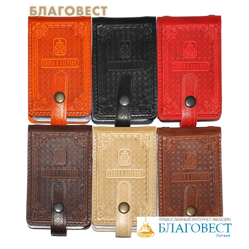 Изделие изготовлено из натуральной кожи. Цвет черный. На лицевой стороне располагается изображение православного креста с надписью "СПАСИ И СОХРАНИ, с обратной стороны - государственный герб Российской Федерации. Конструктивной особенностью данного изделия является наличие в его верхней части специальных крепежных отверстий, усиленных металлическими люверсами, через которые при необходимости можно протянуть крепежный шнурок.Размеры: Длина - 11 см; Ширина - 7 см; Толщина - до 2.5 см.Устанавливаемый в футляр пластиковый блок с кармашками может вместить в себя до 16 пластиковых карт. В дополнительном окне расположенном в кожаной обложке можно разместить часто используемую банковскую карту. Удобный, красивый, недорогой подарок для близкого человека.