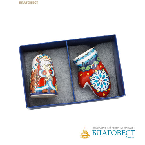 • Набор из 2-х елочных игрушек Дед Мороз и Варежка, высота 6см, керамика