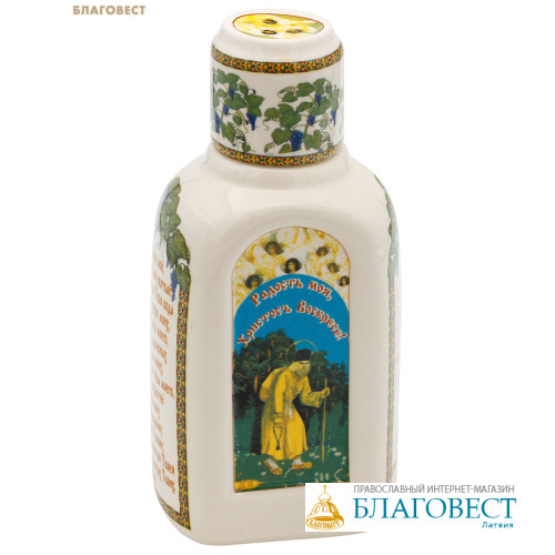Сосуд для святой воды изготовлен из фарфора и покрыт глазурью. Объем 0,8 литра. На стенках изделия расположены иконы и молитвы, нанесенные с использованием деколей. Крышка может использоваться, как стаканчик.Фарфор - благороднейший и наиболее совершенный вид керамики. Фарфоровую смесь тщательно вымешивают, процеживают и отливают в специальные формы. Отформованные предметы трижды обжигают: сначала до температуры 700-800 градусов, затем покрывают глазурью и обжигают до 1200-1350 градусов, после изделия расписывают и снова отправляют в печь, чтобы роспись была яркой и стойкой.Недаром фарфор величают «белым золотом». Его издревле изготавливают по всему миру. Само слово «фарфор» созвучно со словом Фавор. «Гора Фавор, земное небо, отрада души и услаждение глаз православных людей. Ибо этой горе присуща преосеняющая ее некая божественная благодать, оттого она и возбуждает духовную радость» - сказал свт. Григорий Палама. Так и изделия из фарфора изготавливаются не только для пользы, но для души, чтобы радовать глаз и греть душу.