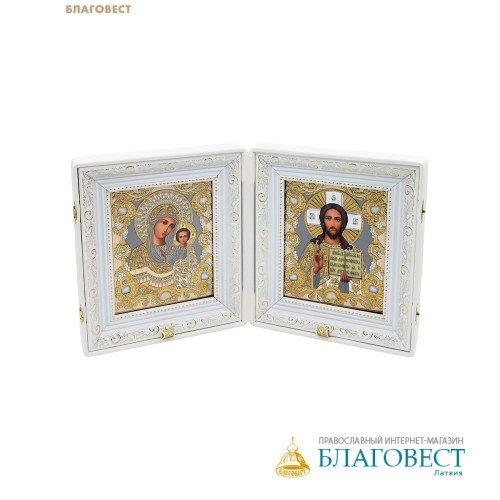 Складень представляет собой изящный футляр, отделанный искусственной кожей со вставкой из жаккарда. В закрытом виде фиксируется на два металлических замка. Внутри размещены иконы Спасителя и Пресвятой Богородицы, оформленные в багетные рамки под стеклом. Именно перед этими образами священник читает молитвы во время таинства венчания.В сложенном виде складень надёжно защищён, компактен и удобен для хранения. В раскрытом становится домашним иконостасом, напоминающим о дне бракосочетания.Прекрасный памятный подарок на свадьбу или годовщину семейной жизни.