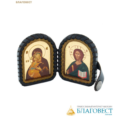 Складень кожаный Пресвятая Богородица «Владимирская» – Спаситель, размер 4,5х6см (в раскрытом виде 9,6см), дерево