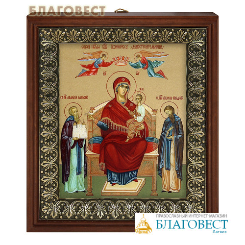 Икона выполнена на оргалите методом УФ-печати, что обеспечивает высокое качество и долгую сохранность изображения. Золочение произведено с помощью поталя (имитация сусального золота).Икона установлена в узкий киот-рамку со стеклом, выполненную из натурального дерева и инкрустированную басмой. Имеется крепление на стену.Икона написана в канонах Русской Православной Церкви.