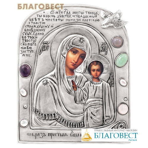 Небольшая икона Богородицы "Казанская" в уникальном авторском гальваническом окладе, украшенном разноцветными камнями, хризмой и изображением голубицы, является копия иконы конца 19 - начала 20 века.Материалы: Дерево, пигментные краски, матовый лак, медь, серебрение, аметист, перламутр, агат, нефрит, розовый кварцТехника изготовления: УФ-печать, гальванопластика, гальваническое серебрениеИкона соответствует православным канонам и освящена.
