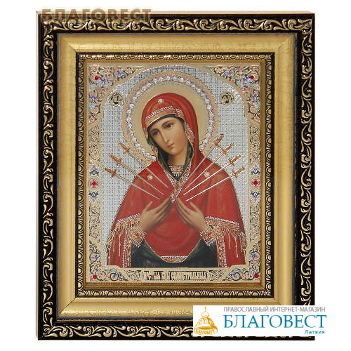 Этот образ иллюстрирует пророчество святого Симеона Богоприимца о том, что Богородице пройдет оружие через сердце. Под оружием подразумеваются боль и страдания Божией Матери в земной жизни. Икона выполнена в полиграфической технике с соблюдением православной традиции. Украшена стразами и вставлена в узкий киот.